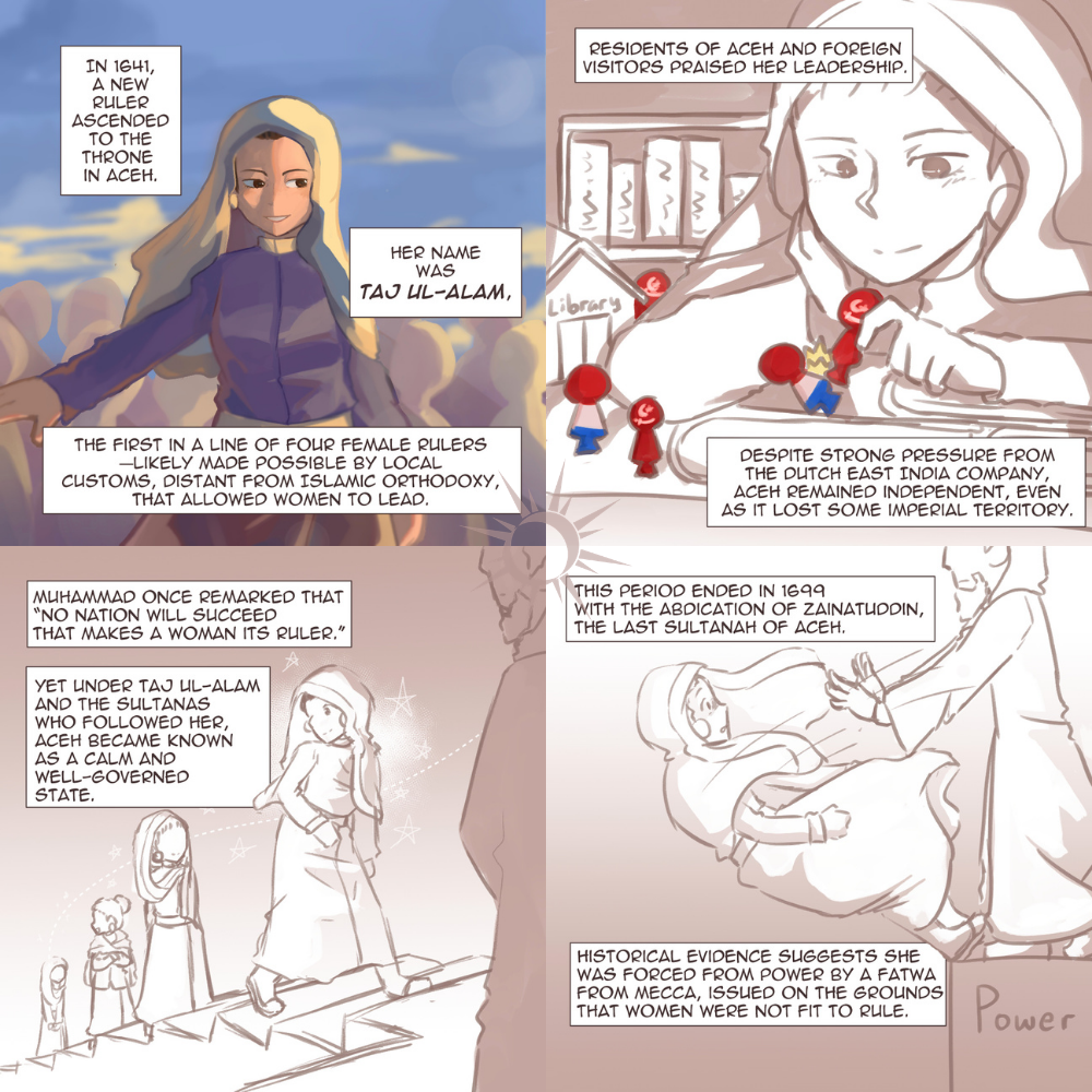 In 1641, a woman ascended to the throne of the Indonesian sultanate of Aceh: Taj ul-Alam. By this point in history, female rulers of Islamic states had been rare, but not unheard of. Figures like Shajar al-Durr of Egypt, Razia Sultana of Delhi, and Khadijah of the Maldives had all proven their worth as Muslim leaders in their own ways. But there was one caveat: the further away they were from Islam’s historical centers, the less controversial their rule was.
